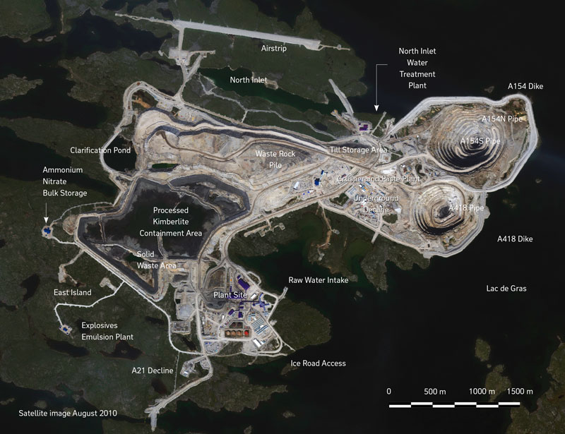 The mine site is located in Canada’s remote wilderness on a 20 square kilometer island, at Lac de Gras, Northwest Territories, approximately 300 kilometers from Yellowknife, the territorial capital, and just 220 kilometers south of the Arctic Circle.